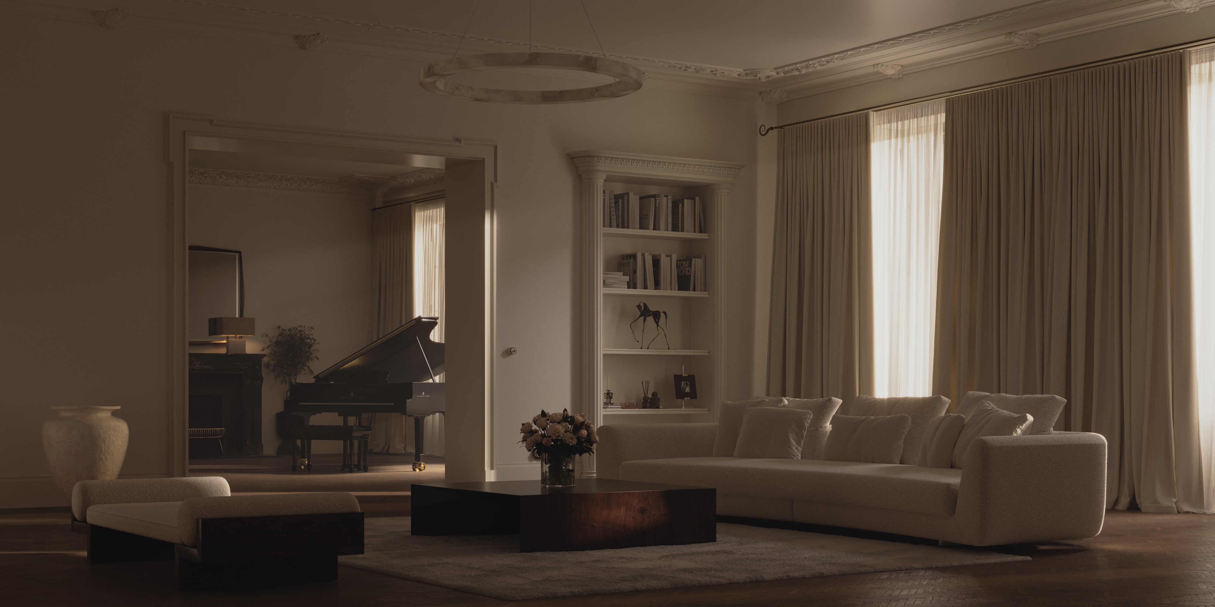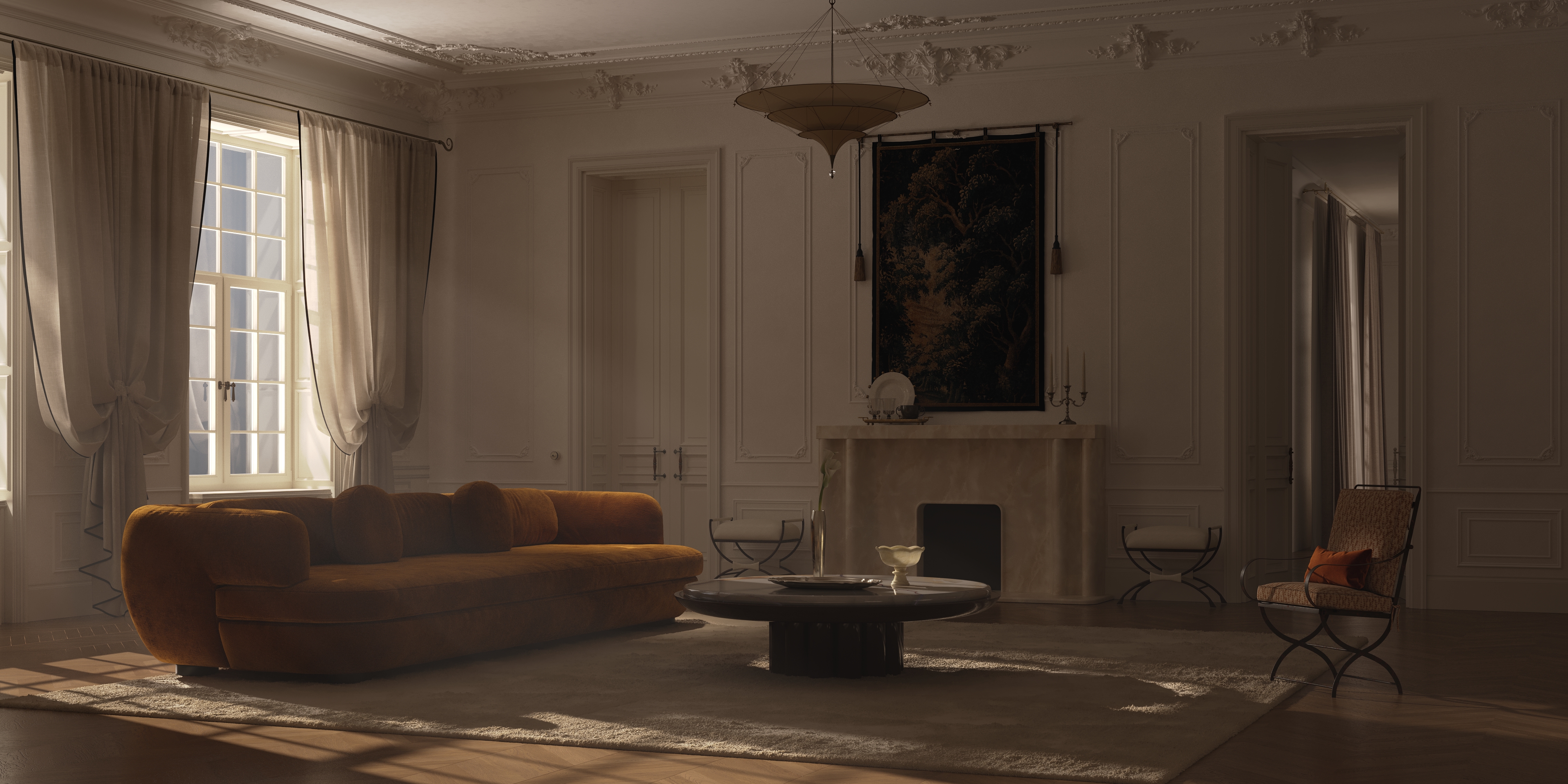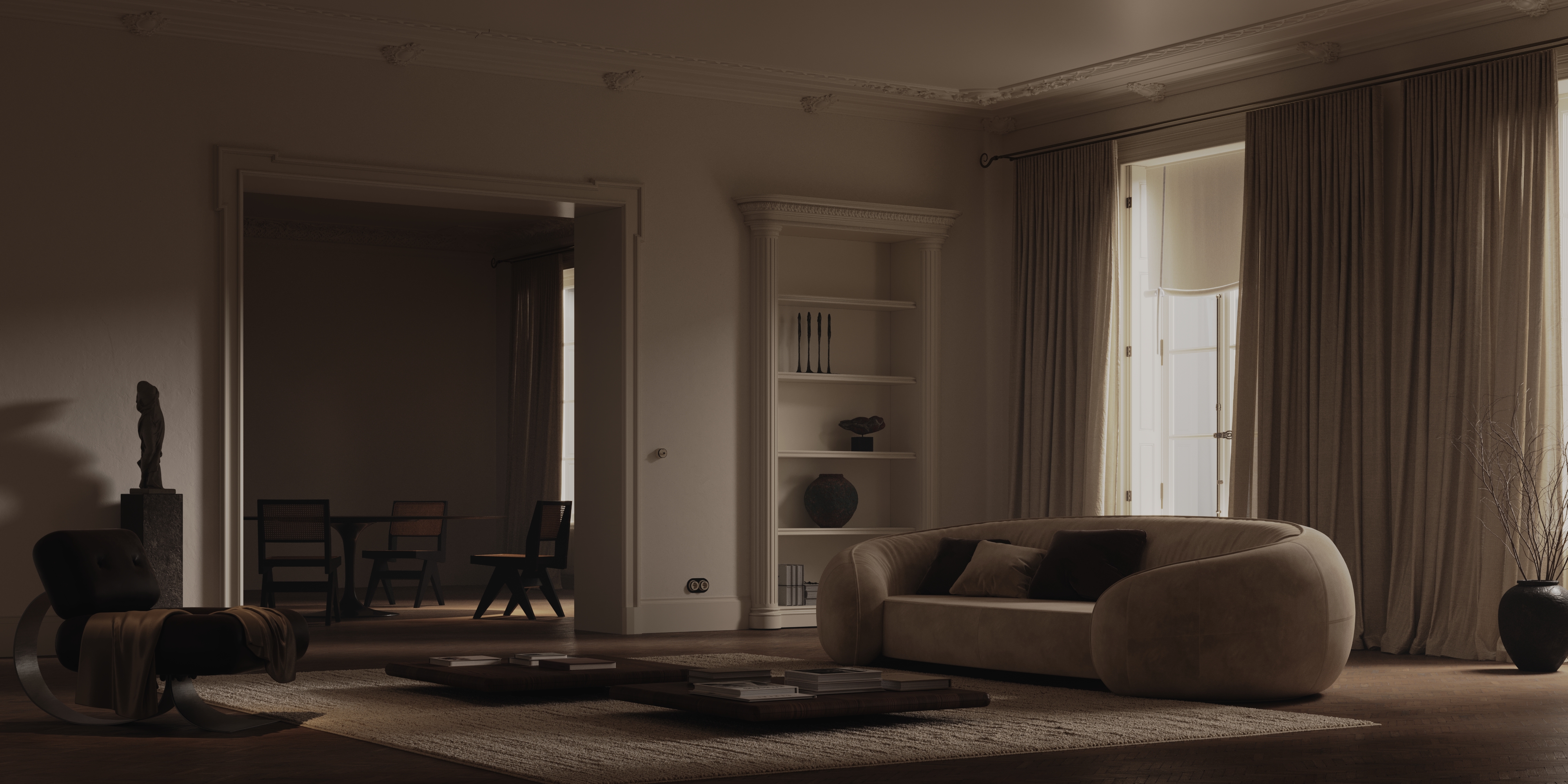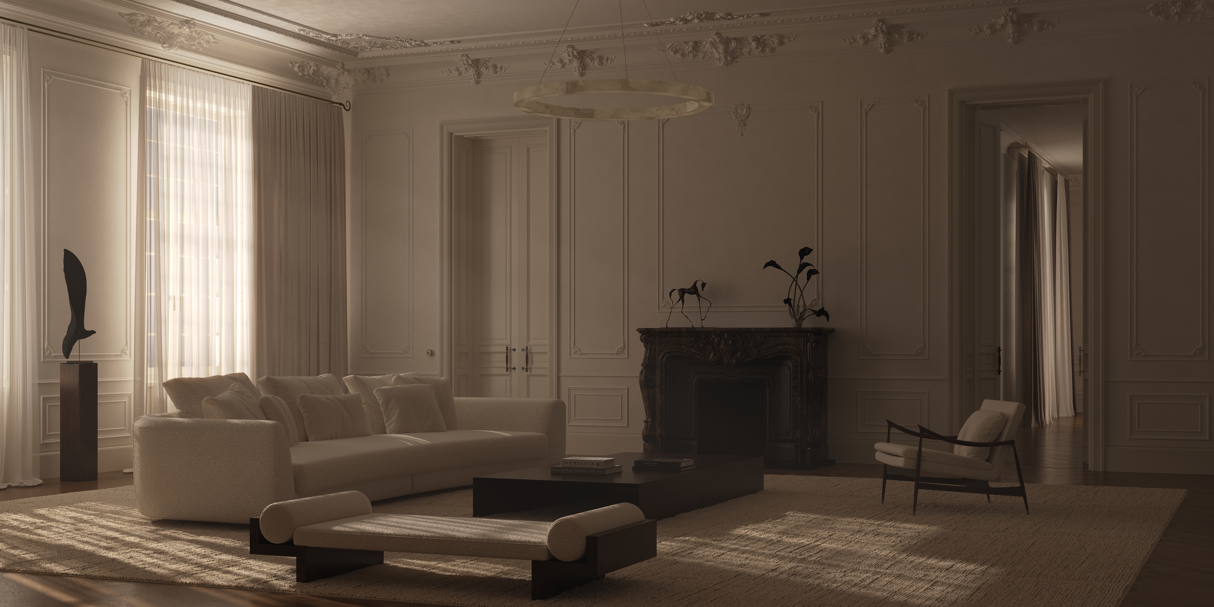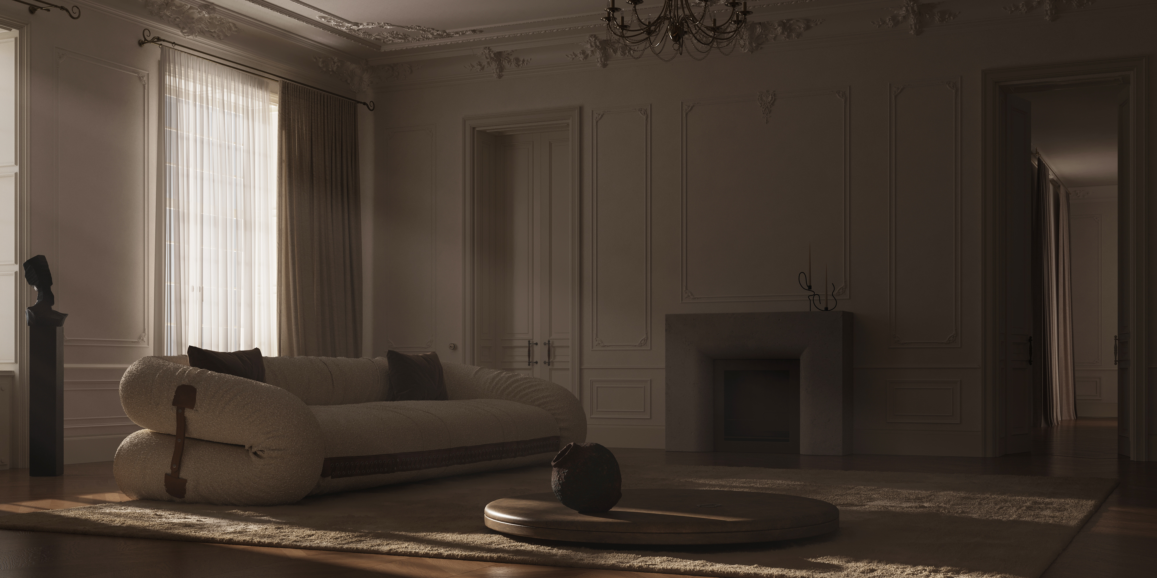 I create a single conceptual interior portrait. One frame. One atmosphere.